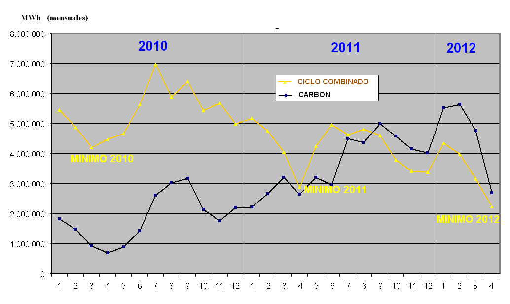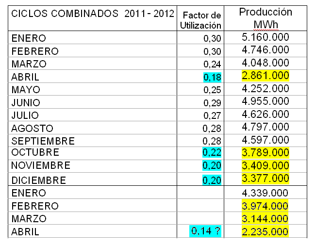 Evolucion producción MWh de ciclos combinados. Fuente REE